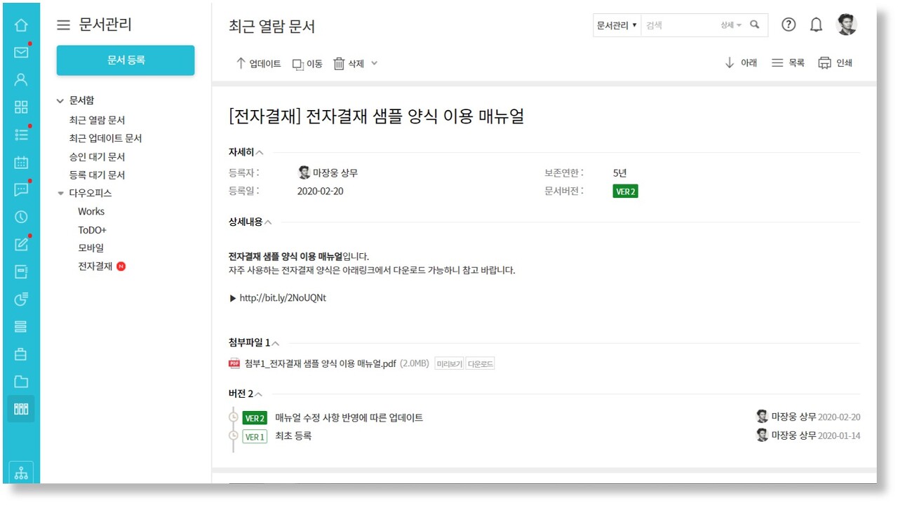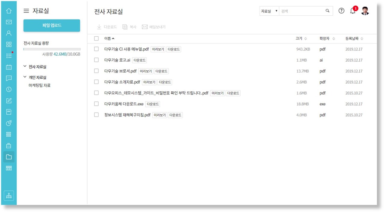자료실, 문서관리 기능은 체계적으로 파일을 관리할 수 있을뿐만 아니라 폴더 공유, 자동 메일 첨부 기능을 통해 떨어져 있는 동료들과 손쉽게 파일을 공유할 수 있습니다. 문서관리의 경우 문서이력이 남기 때문에 업데이트 현황을 파악할 수 있죠!