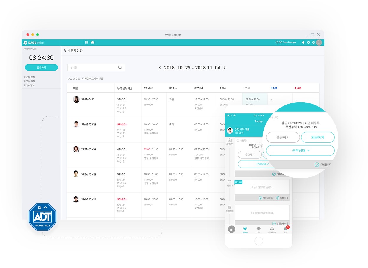 다우오피스는 유연근무제를 적용한 근태관리 기능을 제공합니다. 사용자는 출퇴근 현황을 개별적으로 보고할 필요없이 집에서 간편하게 출퇴근 버튼만 클릭하면 자동으로 출퇴근 내역이 기록됩니다.