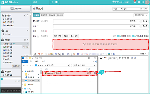 ▶ 메일 작성 시 첨부파일을 Drag & Drop 업로드 방식으로도 파일 첨부가 가능합니다.