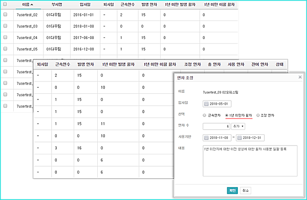 4) 연차 조정을 통해 중도 입사자에 대한 입사일, 발생 연차, 월차를 추가할 수 있습니다.