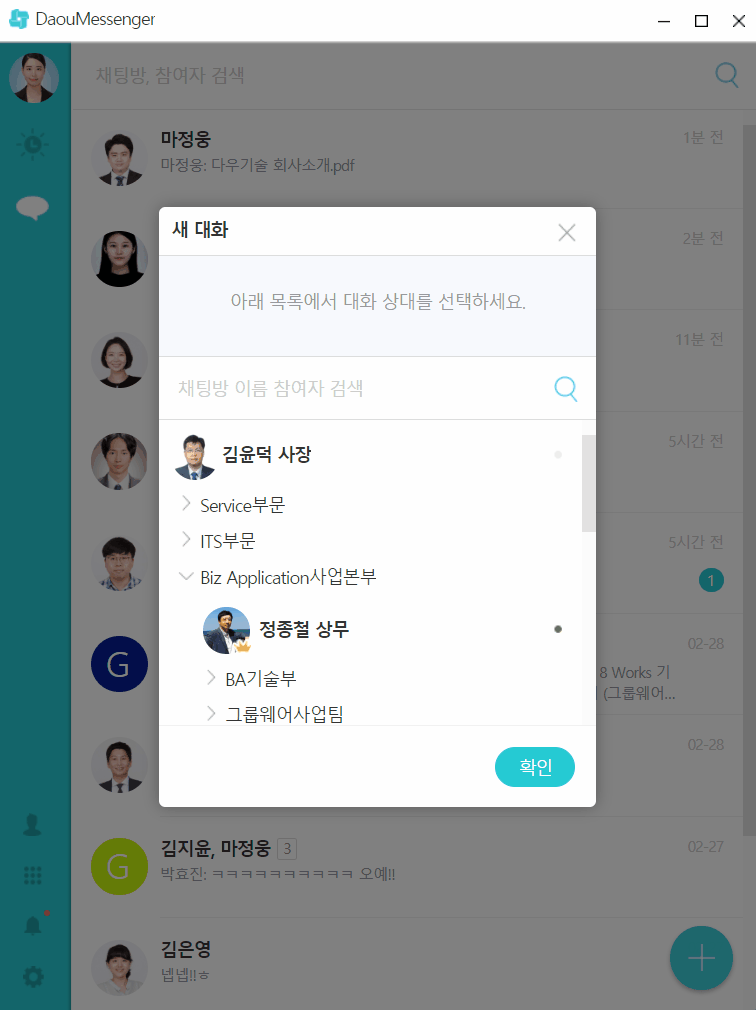 카**톡과 같은 개인 메신저 대신 다우오피스 메신저를 사용하게 되어 업무 집중도가 상승하게 되었습니다.