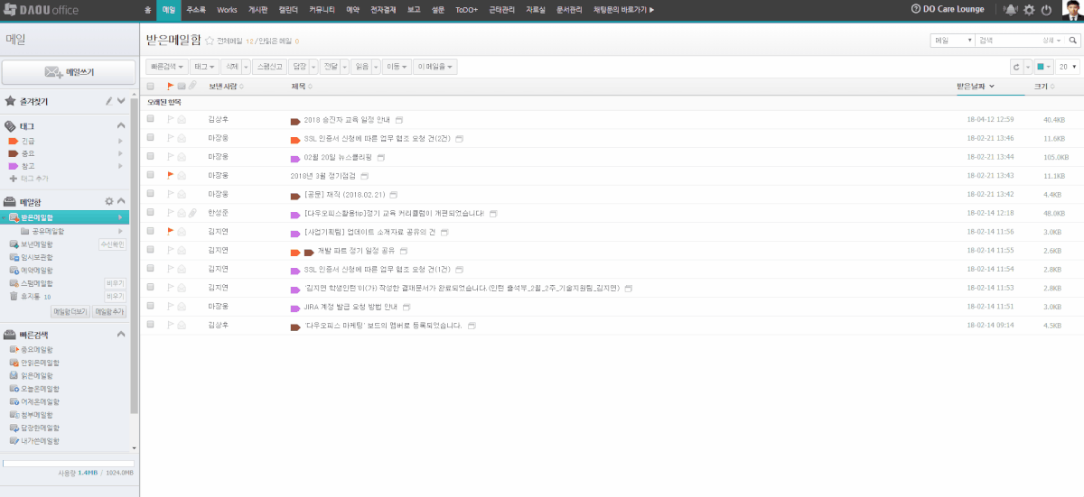공유 폴더를 만들어 프로젝트로 관리하기도 편하고, 메일 수신 시 즉각 알림이 뜨는 등 다방면에서 업무 처리 속도를 빠르게 할 수 있습니다.