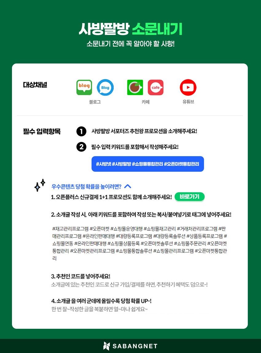 | 오픈마켓 셀러들 모여라🙋 - 사방넷에서 1+1 프로모션으로 최대 60% 할인 받는 법! (0) | 2021.11.30 |