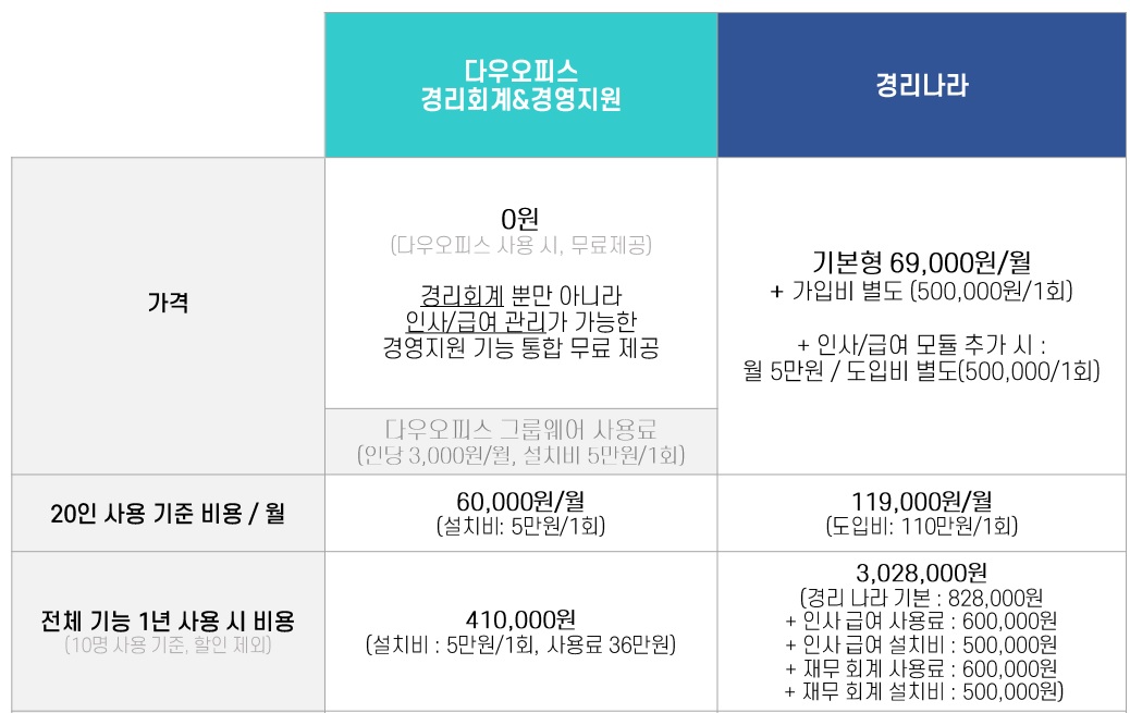 비용과 관련하여서는 다우오피스와 경리나라 사이에 몇 가지 중요한 차이점이 있습니다.