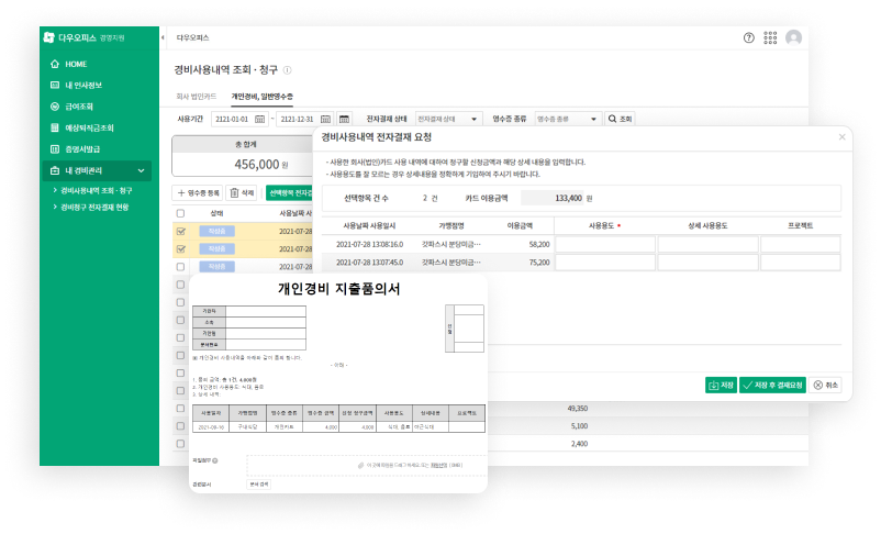 다우오피스는 직원들이 모두 함께 사용하는 그룹웨어(협업관리)에서 부 터 시작되어 경리회계/경영지원 기능 또한 임직원 모두가 사용할 수 있는 구조입니다. 회계/인사와 관련된 기본 기능에 전자결재 연동이 되기 때문에 결재 프로세스가 필요한 경우, 한 번에 처리할 수 있습니다. 또한 경비처리에 편리함을 제공하기 위해서 사원별 경비처리가 가능하도록 제공됩니다.