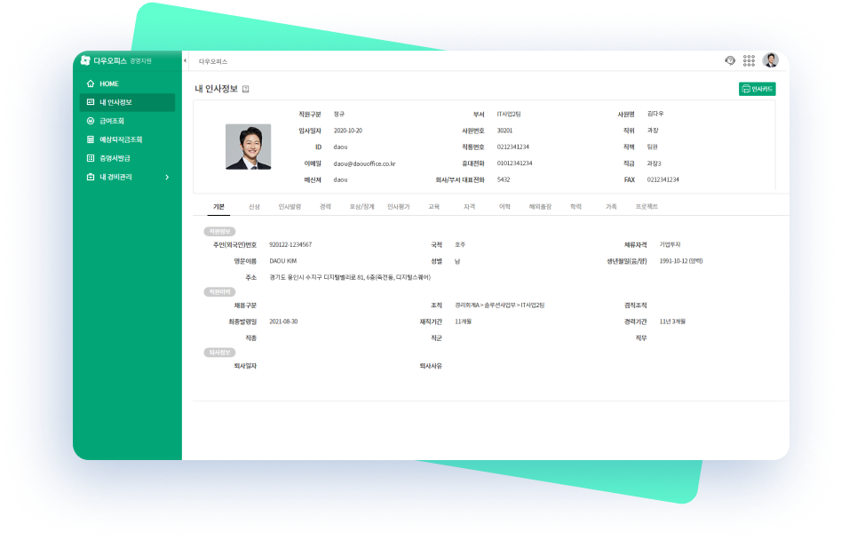 다우오피스 경리회계를 사용하면, 인사/급여 기능을 완벽하게 제공하는 다우오피스 경영지원 기능 또한 기본 제공되기 때문에 최근 이슈가 된 급여명세서 교부화 뿐만 아니라 각종 인사 관련 증명서 발급 및 법인/개인 카드 사용에 대한 경비관리가 가능합니다.