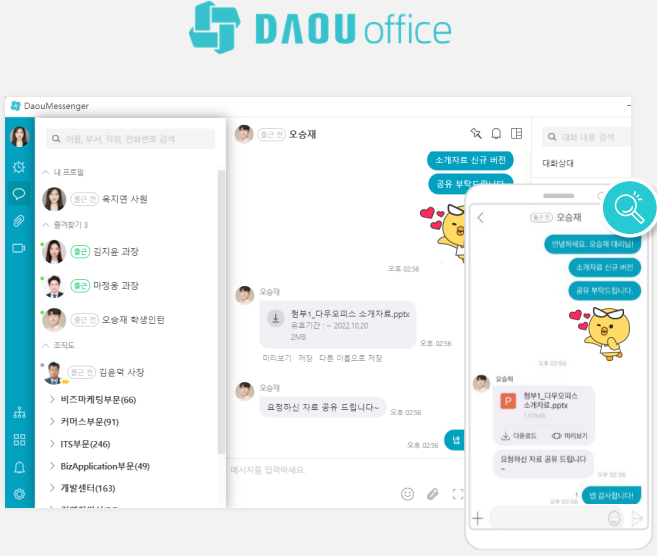 다우오피스와 카카오워크는 언제 어디서나 메신저를 통해