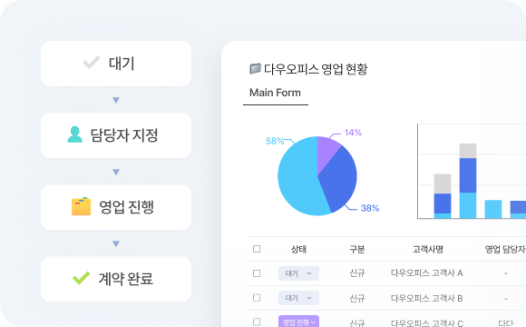 대기 → 담당자 지정 → 영업 진행 → 계약 완료와 같은 영업 프로세스를 한 눈에 알아보고