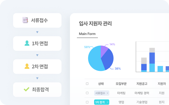 서류 접수 → 1차 면접 → 2차 면접 → 최종 합격과 같은 입사 지원자 관리 현황을 한 눈에 알아볼 수 있고