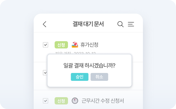 또한 결재 대기 문서를 일괄 결재할 수 있기 때문에 인사 담당자의 편리성을 아주 높여줍니다. 😎