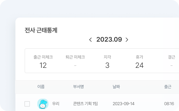 일/주/월 별로 제공되는 근태 데이터로 한 눈에 직원들의 근태 통계를 파악하기 아주 쉽답니다.🧐