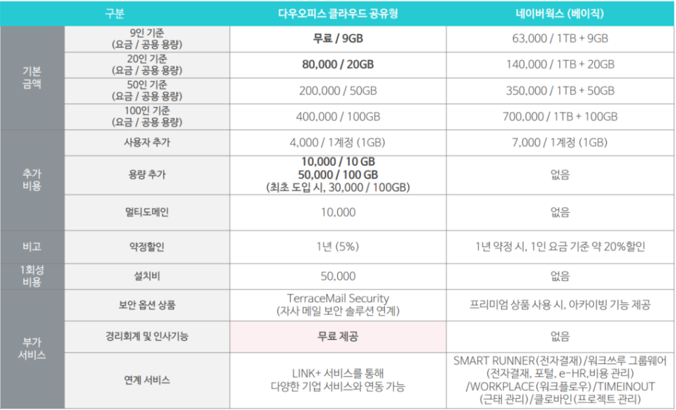 다우오피스 클라우드 공유형 상품의 경우 20인 패키지를 월 6만원에 공용용량 20GB를 제공하고 있습니다.