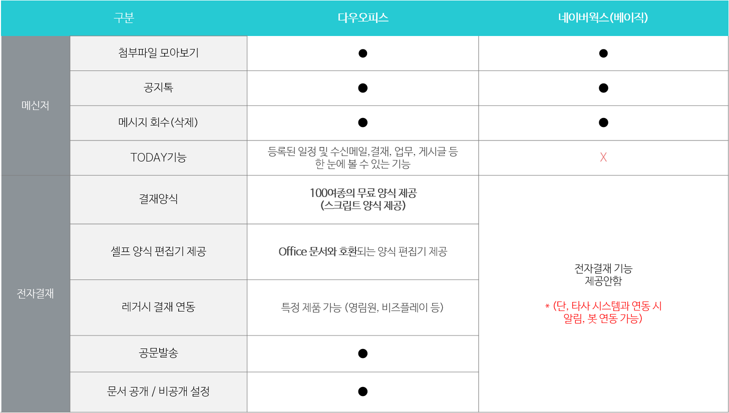 다우오피스는 총 20가지의 기능을, 네이버웍스는 총 13가지 기능만 제공하다 보니