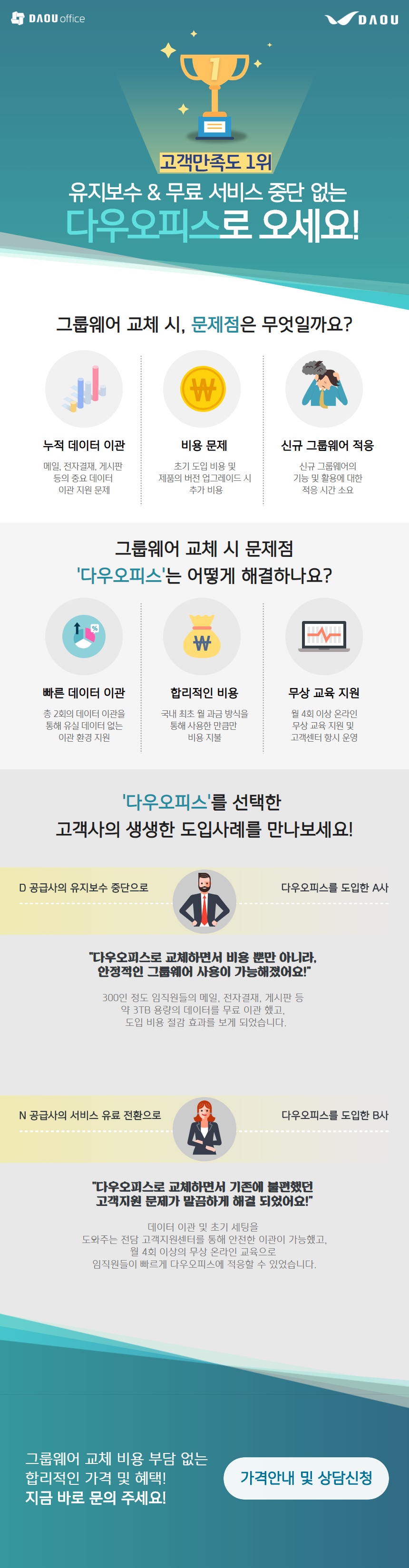 고객사 구축형(고객사 설치형) 그룹웨어 교체로 고민중이신가요?유지보수 비용 부담&서비스 중단 없는 고객만족도 1위 다우오피스로 오시면특별한 혜택을 만나보실 수 있습니다!