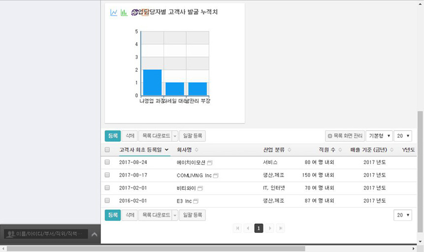 영업팀에서 신규 고객 사 발굴 시, 고객사 기본정보, 컨텍포인트, 매출정보, 영업담당자 데이터 등을 입력하고 진행되는 상황에 대해 영업팀 및 협업하는 동료들과 히스토리를 공유할 수 있습니다.