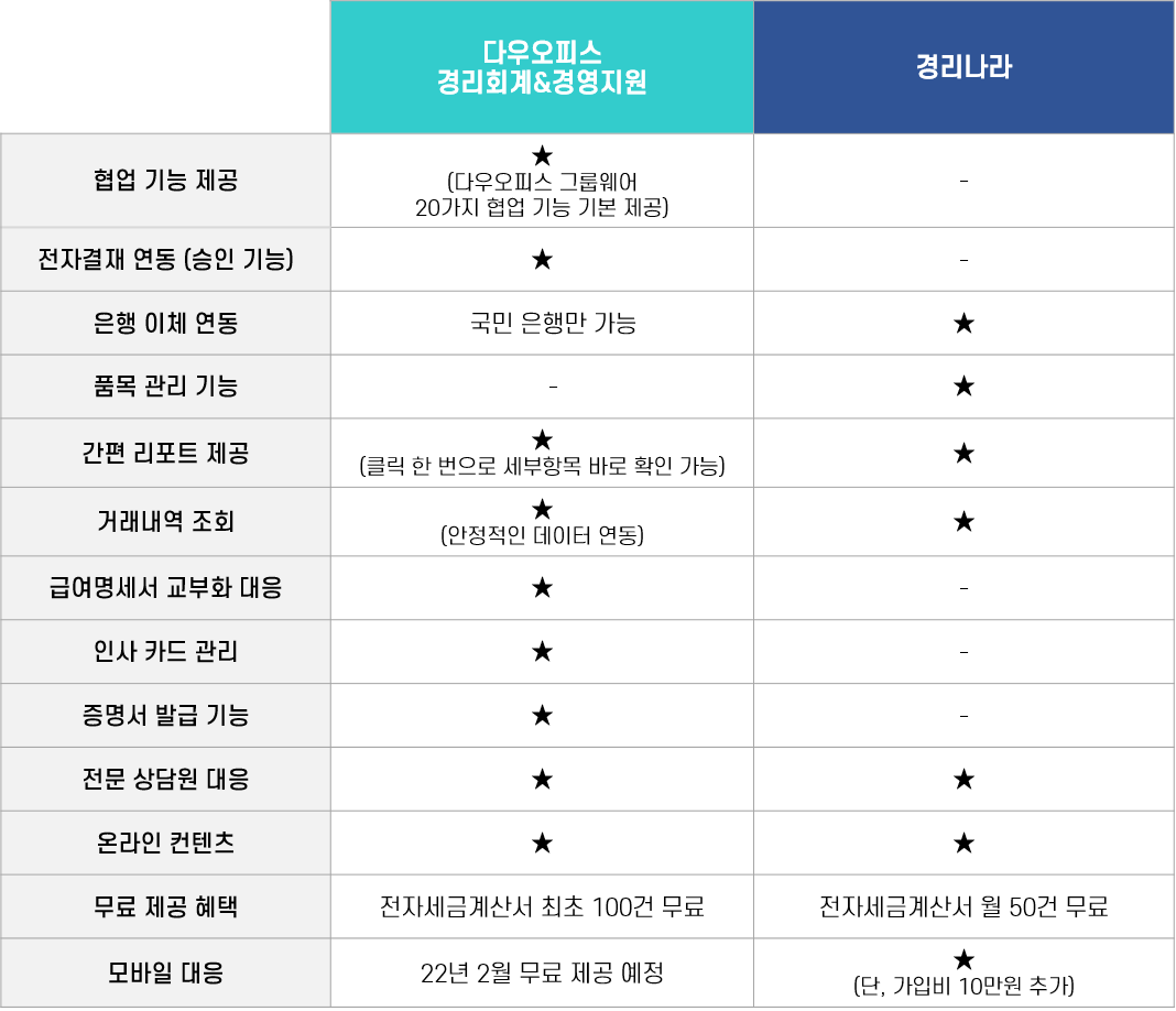 * 상세 기능 비교표가 궁금하시다면 [다우오피스 경리회계 vs 경리나라 비교자료]를 다운로드하여 확인해 보세요!
