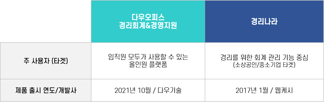 경리나라는 17년도에 출시되어 경리 업무 처리 용도로 사용되고 있으며 다우오피스 경리회계는 더 최근인 21년도에