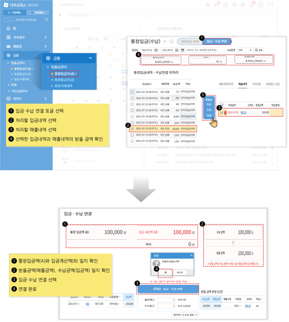 마지막! [금융] ▶ [입출금관리] ▶ [통장입금(수납)]에서 입금·수납 연결 방법과 마찬가지로