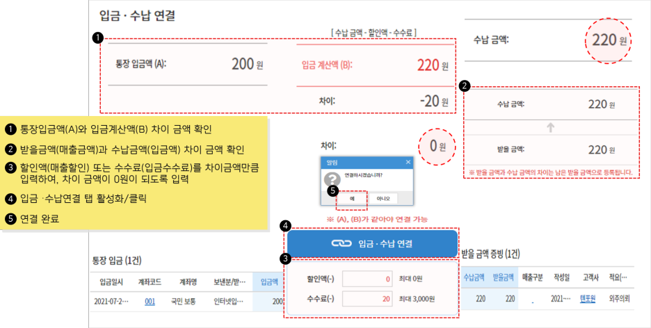 할인액(매출할인) 또는 수수료(입금 수수료)를 차이 금액만큼 입력하여, 차이 금액이 0원이 되도록 조정하면