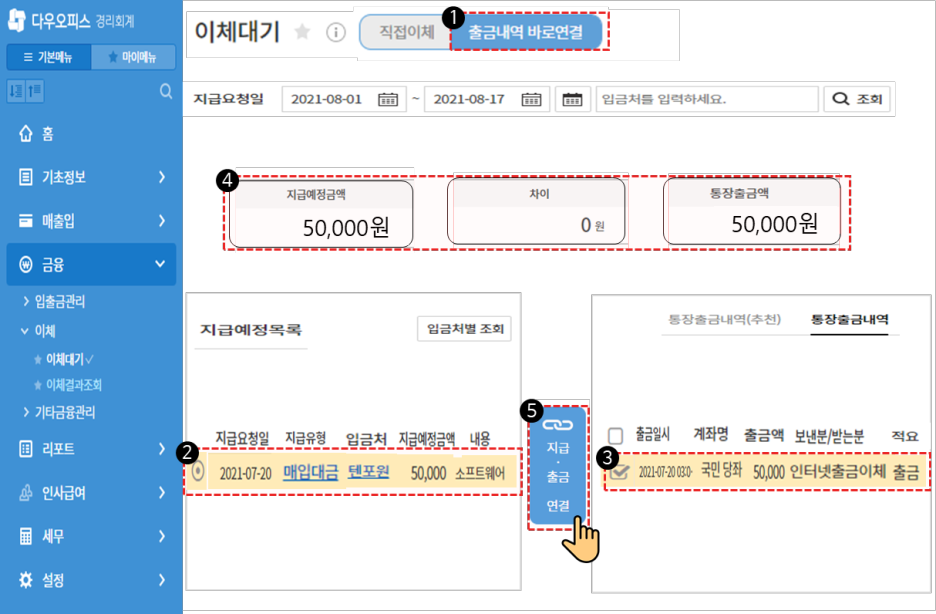다우오피스 경리회계에서는 매입대금 지급결의가 완료된 내역을 바로 이체할 수 있는 기능도 제공하고 있는데요!
