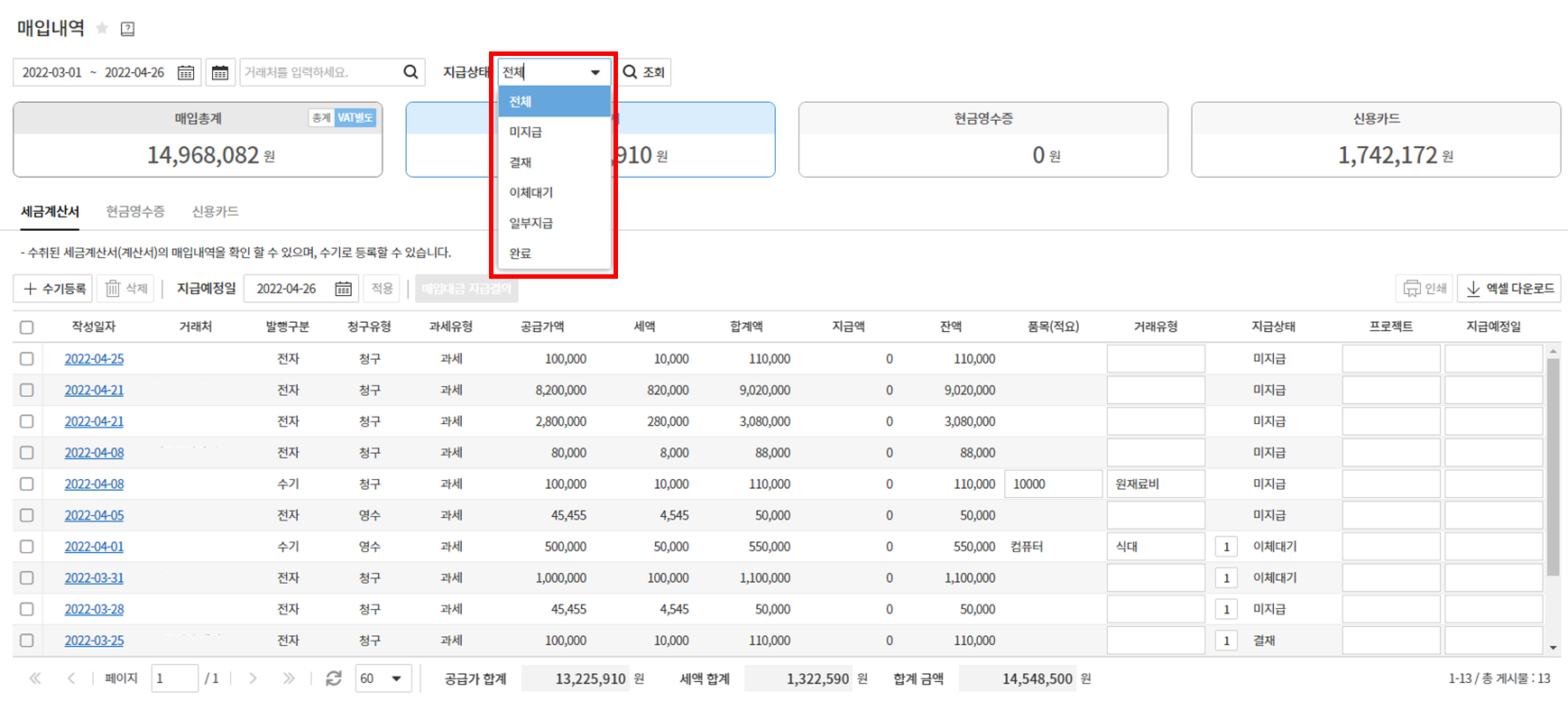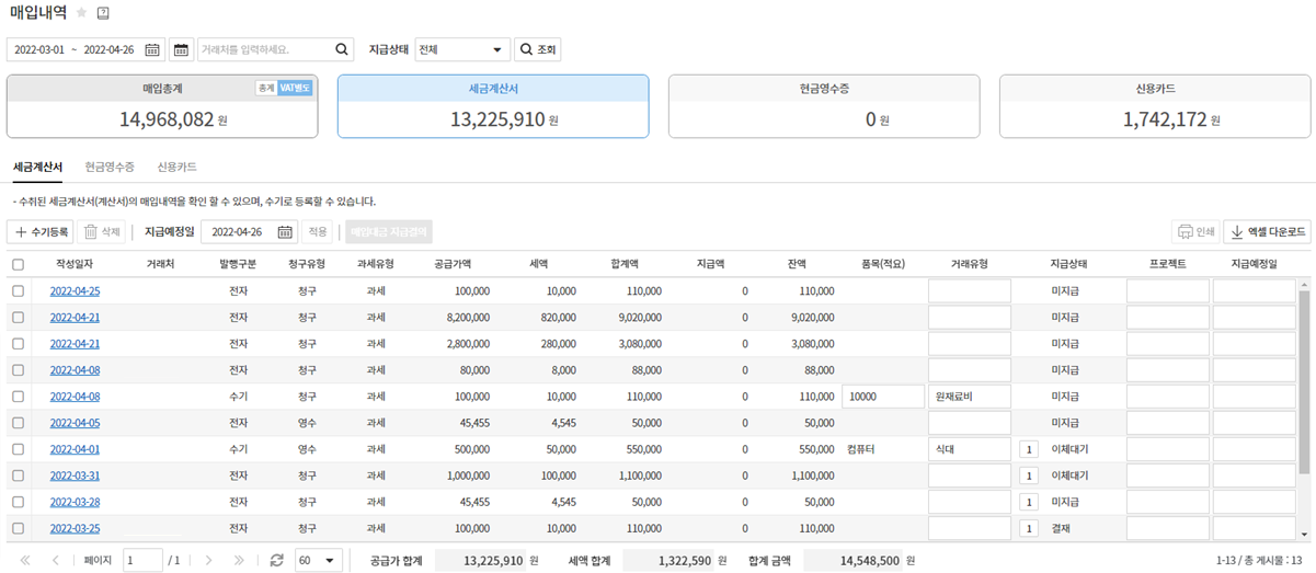 마지막으로 사용내역을 꾸준하게 관리하는 것을 추천드립니다. 매입내역 중 등록된 신용카드가 연결되어 있어서 매입내역이 하루에 두 번 자동으로 올라오기 때문에 품목과 거래유형을 수시로 기입하여 한 달에 한번 한꺼번에 신용카드내역을 다운로드하여 내역을 정리하다 보면 사용내역을 기억하기 힘든 점을 완벽하게 보완할 수 있으니 꾸준히 관리하는 것을 추천드립니다.