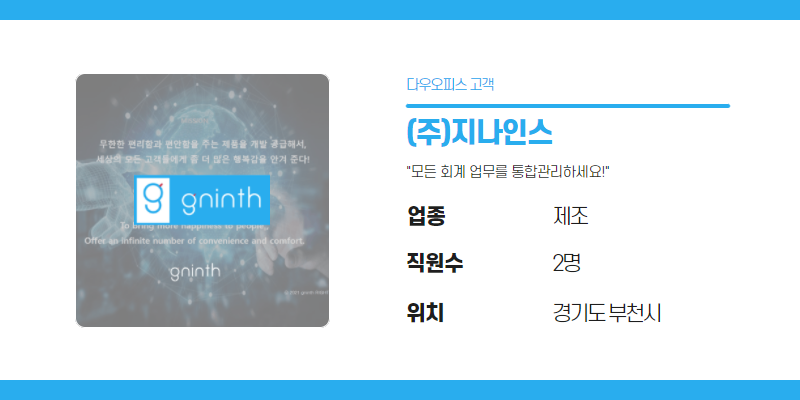 다우오피스 경리회계를 사용하면서 거래처 관리, 매입∙매출관리, 통장 입출금 관리와 급여관리까지 한 번에 통합 관리하면서 업무효율이 상승하게 됐습니다. 5인 이하 소규모 기업이라 처음에는 관리할 자료들이 많지 않을 것이라 생각했지만 시간이 지날수록 데이터량이 방대해져, 회계자료 통합관리 프로그램이 필수적이라는 사실을 깨달았습니다. 그래서 다우오피스 경리회계 도입을 고민 중이신 분들이 계시다면 하루라도 빨리 사용하시는 것을 강력히 추천드립니다!