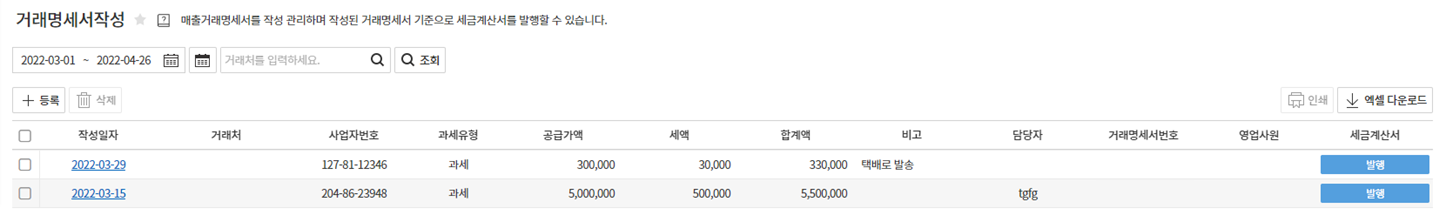 두 번째 추천 사용 팁은 거래명세서 작성입니다. 기존에 번거롭게 엑셀 시트를 사용한 거래명세서 발급으로 문자 오류, 금액 오류, 수량 오류 등이 수시로 발생하였는데 거래처 등록으로 간편하게 거래처 정보를 불러와서 쉽고 빠르게 거래명세서를 작성, 출력하고 세금계산서 발급 시 연동해서 쉽고 빠르게 발급할 수 있어서 추천하고 싶습니다.