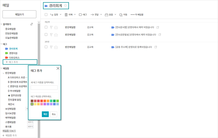 • 다우오피스 메일의 태그 기능으로 메일을 사용자가 메일을 분류, 지정할 수 있어요.