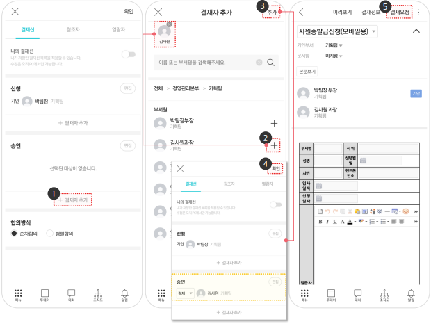파일 첨부, 결재선 자동 생성, 모바일 결재 지원 기능으로