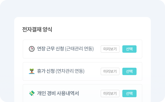 전자결재는 업무 보고 뿐만 아니라 휴가, 연차 등 회사 생활에서 꼭 필요한 기능이죠.