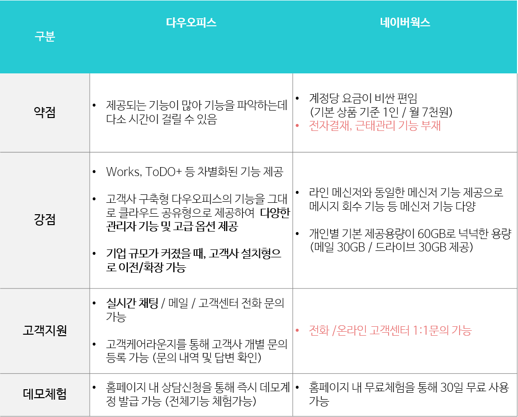 다우오피스는 총 20가지의 기능을, 네이버웍스는 총 13가지 기능만 제공하다 보니
