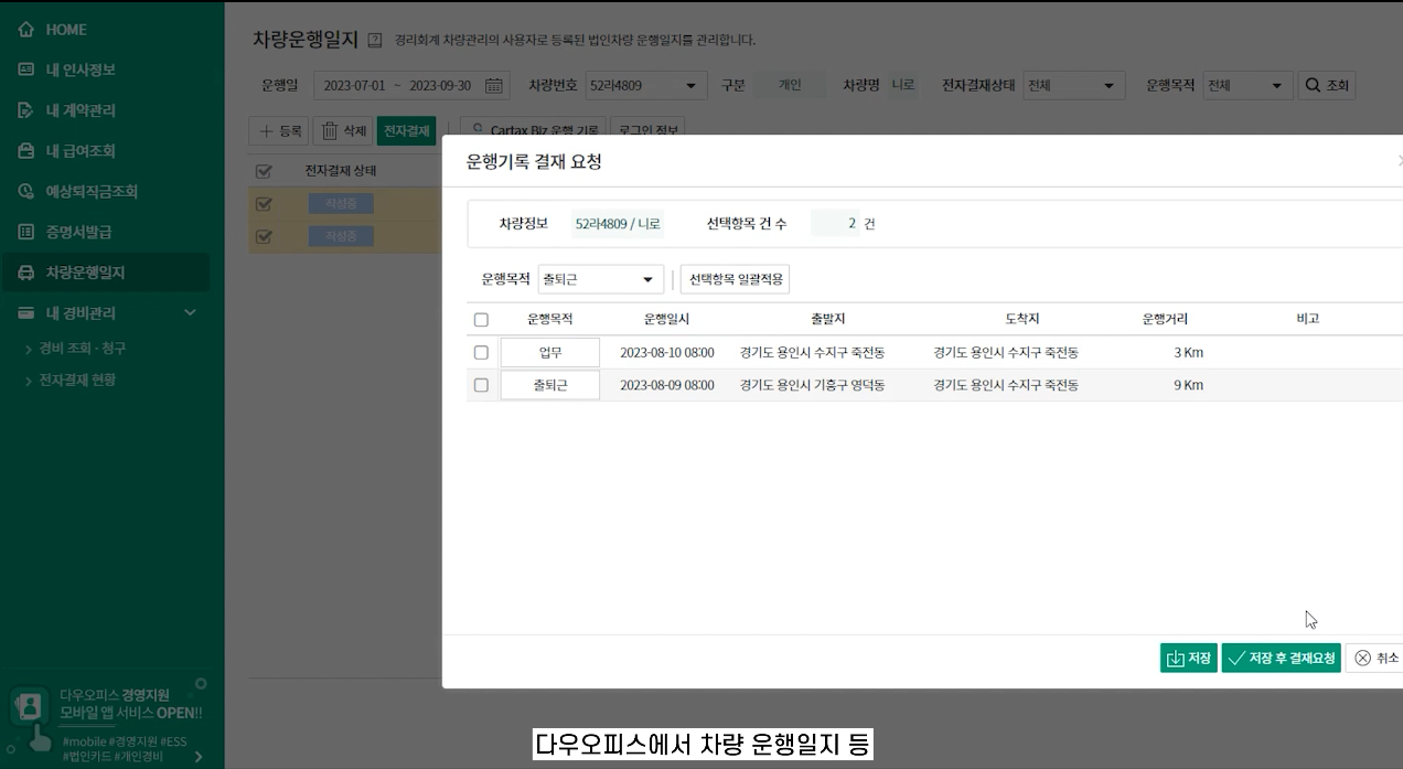 다우오피스에서 차량 운행일지 등 내부 규정에 맞는 전자결재를 상신해요.
