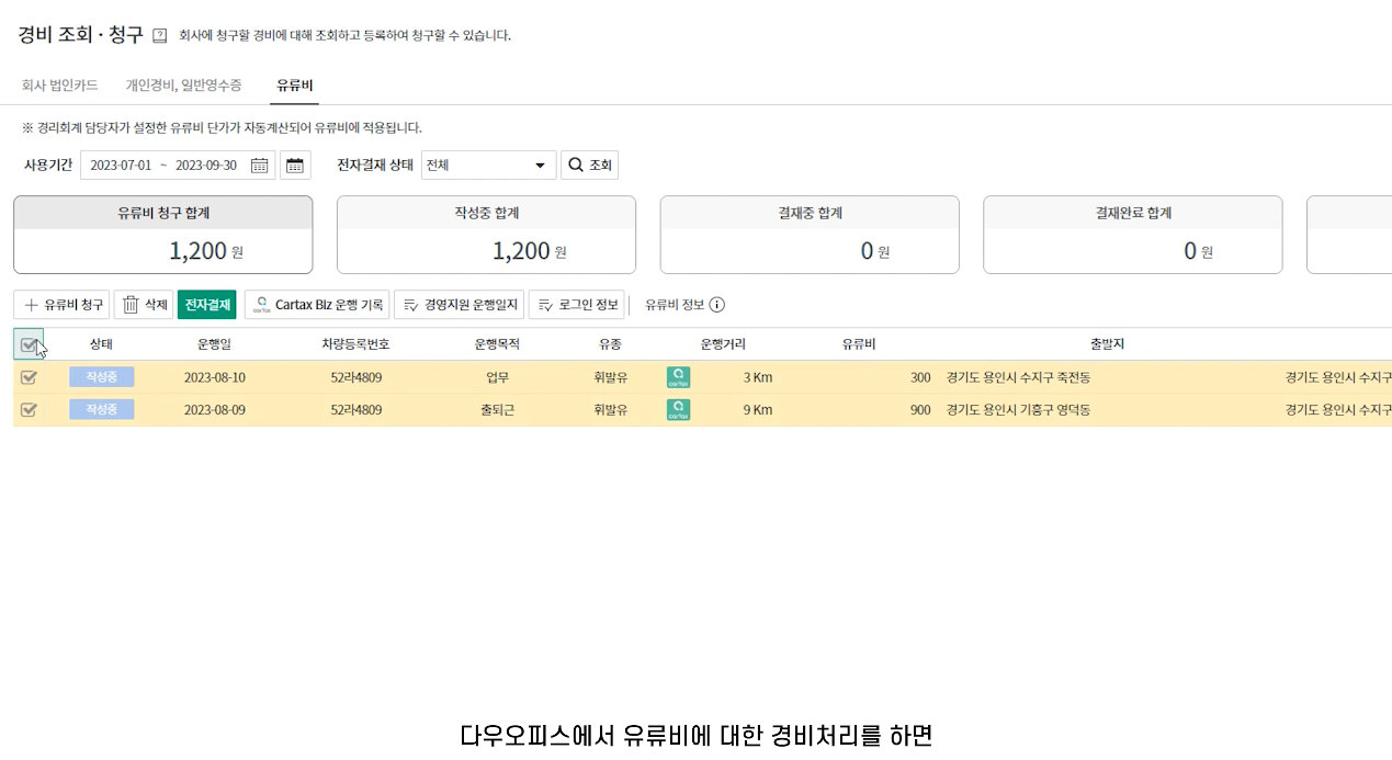 다우오피스에서 유류비에 대한 경비처리를 하면 끝이납니다.