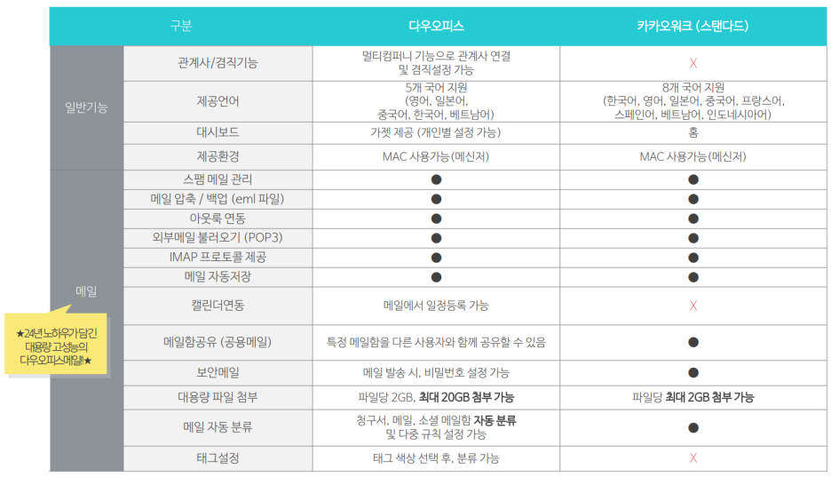 그룹웨어 일반기능/메일 기능 비교
