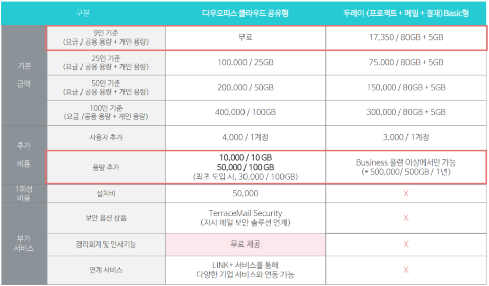 다우오피스 클라우드 공유형과 두레이 베이직 가격 비교 (단위 : 원 / 월)