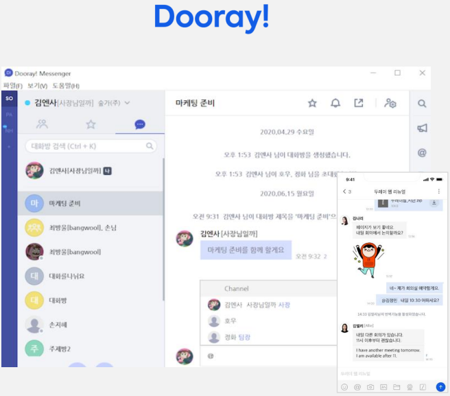 다우오피스와 두레이 메신저 및 모바일 기능 화면 비교