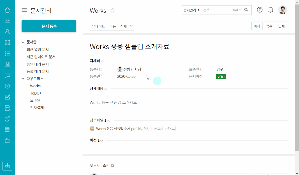 사내에서 공유하는 규정이나 매뉴얼을 공유하고 관리 할 수 있어 문서보존 및 이력 조회가 가능합니다.