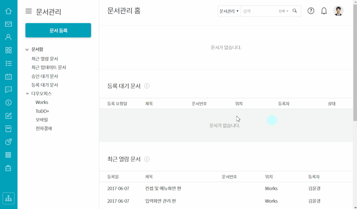 이 모든 것을 해결해줄 다우오피스 문서관리 기능은 전사/팀 단위로 공유할 문서들을 쉽고 간편하게 등록할 수 있습니다.