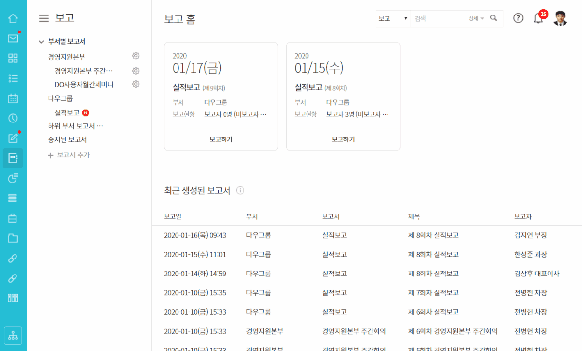 보고 홈의 왼쪽 탭에서 부서별 및 항목별로 체계적으로 보고서를 관리할 수 있습니다.