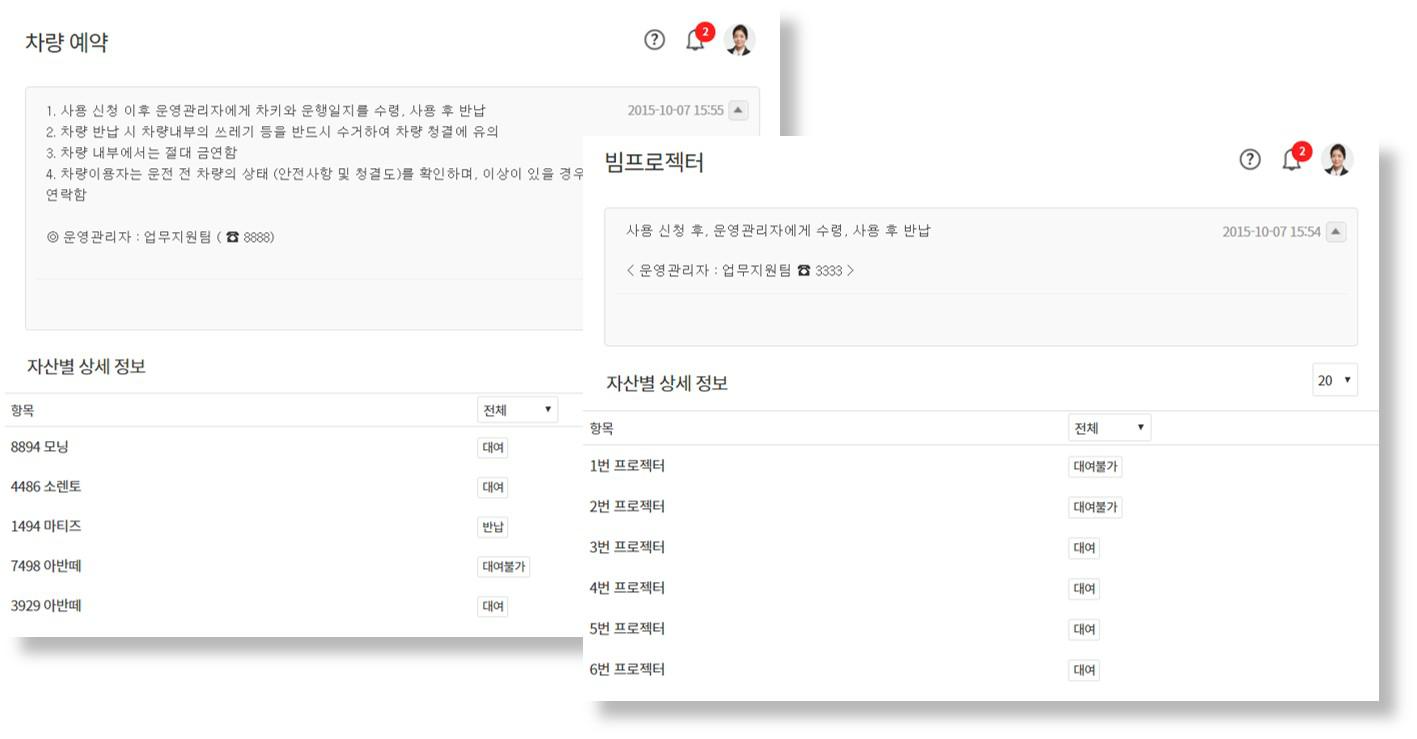 예약 기능을 통해 공동으로 사용하는 자산의 현황을 온라인으로 파악하고 예약&대여가 가능하여 자산의 효율적인 사용이 가능합니다.