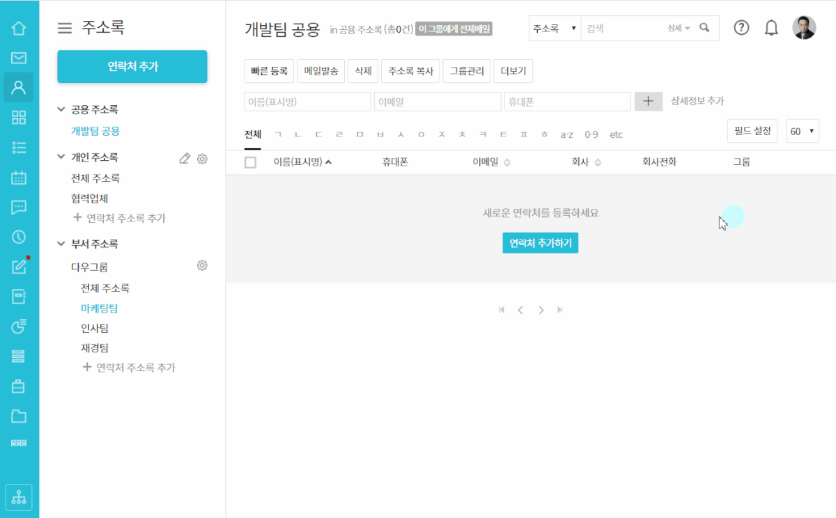 메인화면 왼쪽 탭 위 [연락처 추가]를 클릭한 후 상세 정보를 입력해도 되지만,