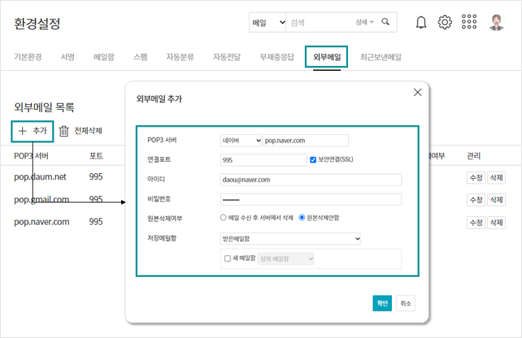 아웃룩 (POP3 / IMAP)과의 연동