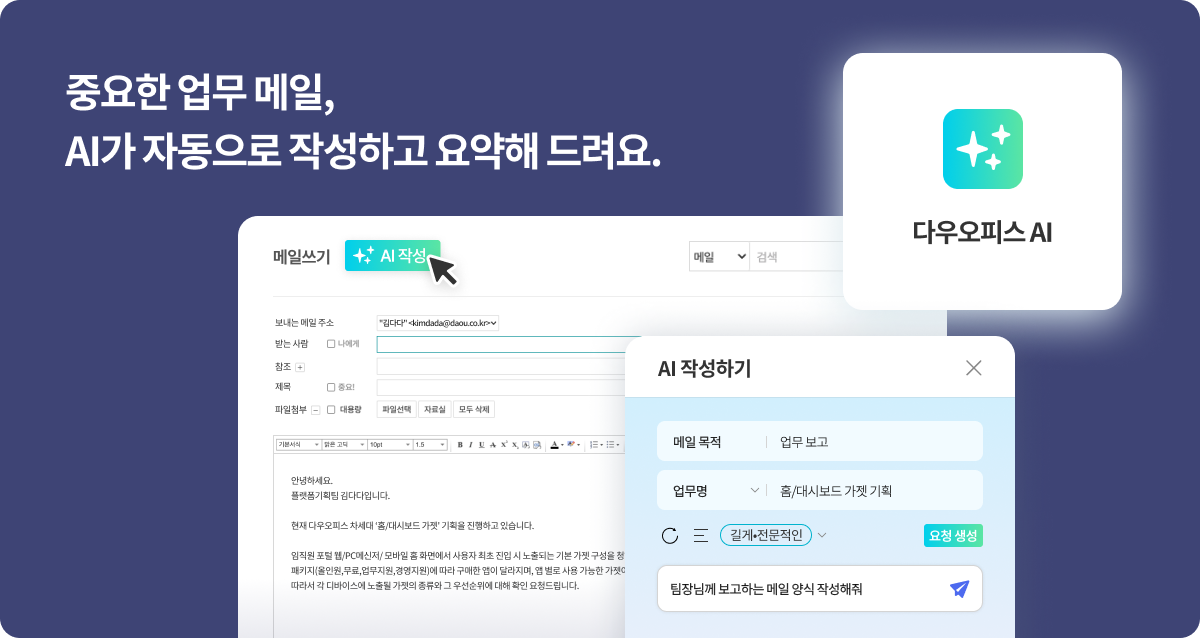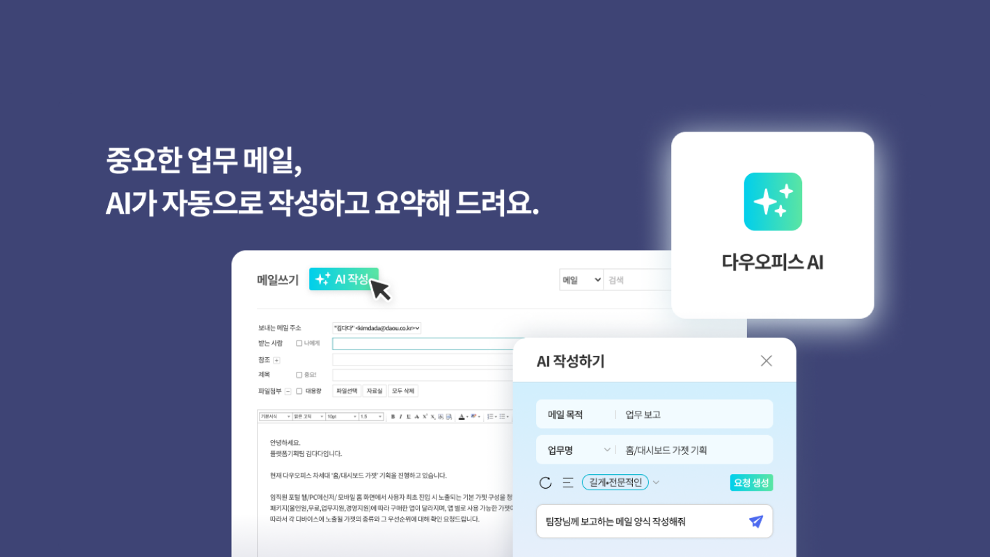 “메일 초안 작성” 기능과 “메일 요약” 기능은 메일 작성과 확인을 간편하게 지원한다. 빠른 메일 작성이 필요한 상황에서 사용자가 메일 초안 작성 기능을 통해 메일을 쉽게 작성할 수 있다. 예를 들어, 거래처에 보내는 감사 인사 메일이 필요할 경우 다우오피스 AI가 문체와 길이 설정을 통해 적합한 초안을 자동으로 생성해준다. 또한, 긴 이메일을 읽을 시간이 부족한 경우 ‘메일 요약’ 기능을 통해 핵심 내용을 빠르게 파악할 수 있다.