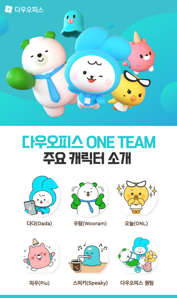 다우기술은 동물을 모티브로, 부드럽고 친근감 있는 '다다, 우람, 오늘, 피우, 스피키' 등 캐릭터 5종을 제작했다. 다우기술은 '다우오피스 원 팀'을 구성하는 캐릭터를 △인사 △회계 △영업·마케팅 △개발 △고객 지원 분야 담당자로 설정, 다양한 기능을 지원하는 다우오피스를 효과적으로 소개하는 데 일조할 것으로 기대했다.