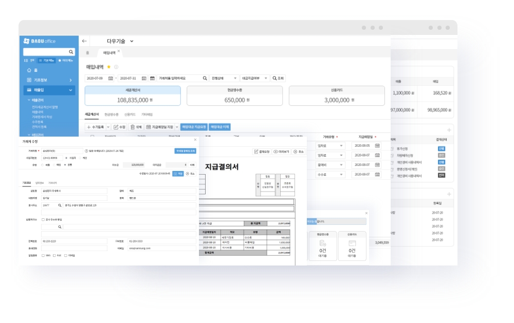 다우오피스를 사용 중인 고객사는 익숙한 사용자 환경에서 경리회계 서비스를 제공받기 때문에 더욱 쉽고 빠르게 적응할 수 있다. 무엇보다 별도 로그인 없이 클릭 한 번으로 그룹웨어와 경리회계 서비스 이동으로 간편하게 이용할 수 있다. 또한 조직정보 연동으로 초기 세팅에 대한 부담을 덜 수 있으며, 경리회계 관련 전자문서 메일 발송, 경비 사용 내역 전자결재 기안 연동 기능으로 업무 효율을 높여준다.