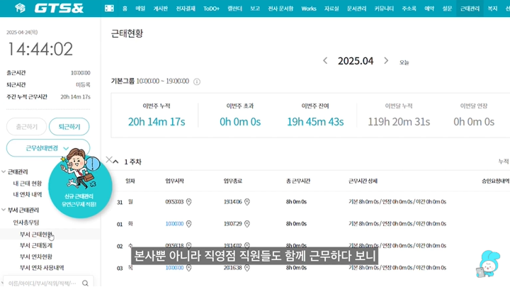 본사뿐 아니라 직영점 직원들도 함께 근무하다 보니 예전에는 근태 관리가 쉽지 않았어요.