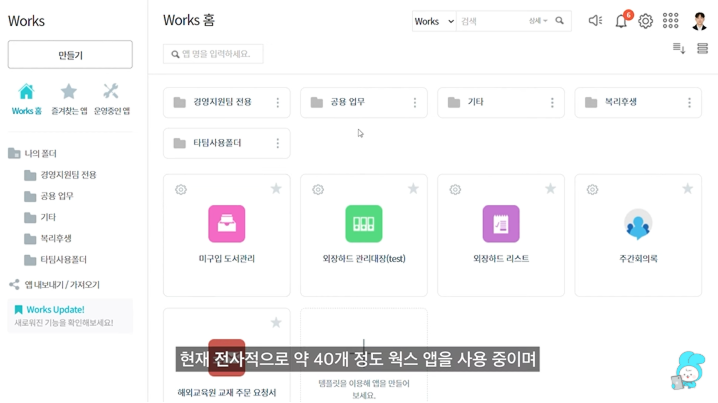 현재 전사적으로 약 40개 정도 웍스 앱을 사용 중이며, 대부분의 업무가 웍스를 통해 진행되고 있습니다.