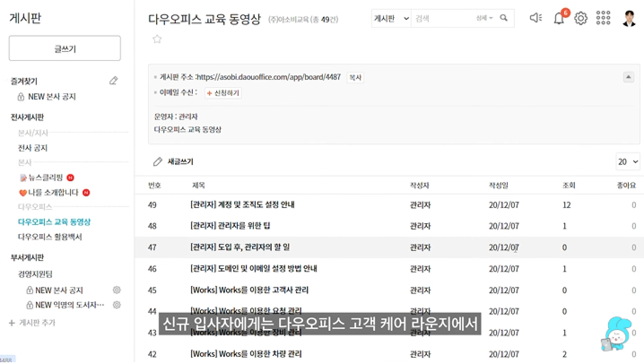 사용 팁은 주간 회의나 사내 공지를 통해 꾸준히 공유했고, 신규 입사자에게는 다우오피스 고객케어라운지에서 제공하는 사용법 영상과 활용 팁을 안내해, 초반부터 자연스럽게 적응할 수 있도록 했습니다.
