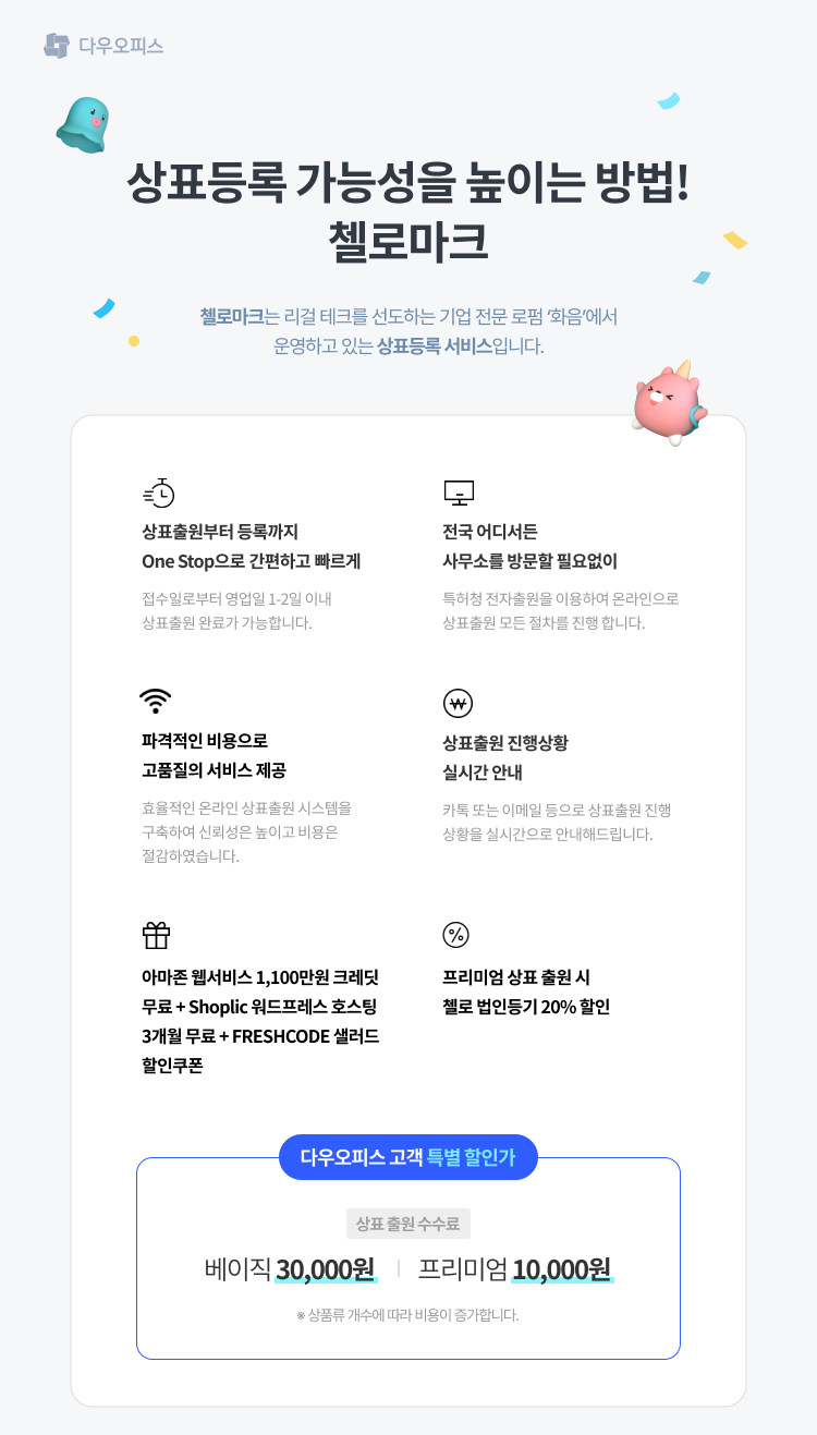 | 특허·상표·저작권 등록 최대 50%할인! [위포커스, 다우오피스 제휴] (0) | 2023.07.17 |