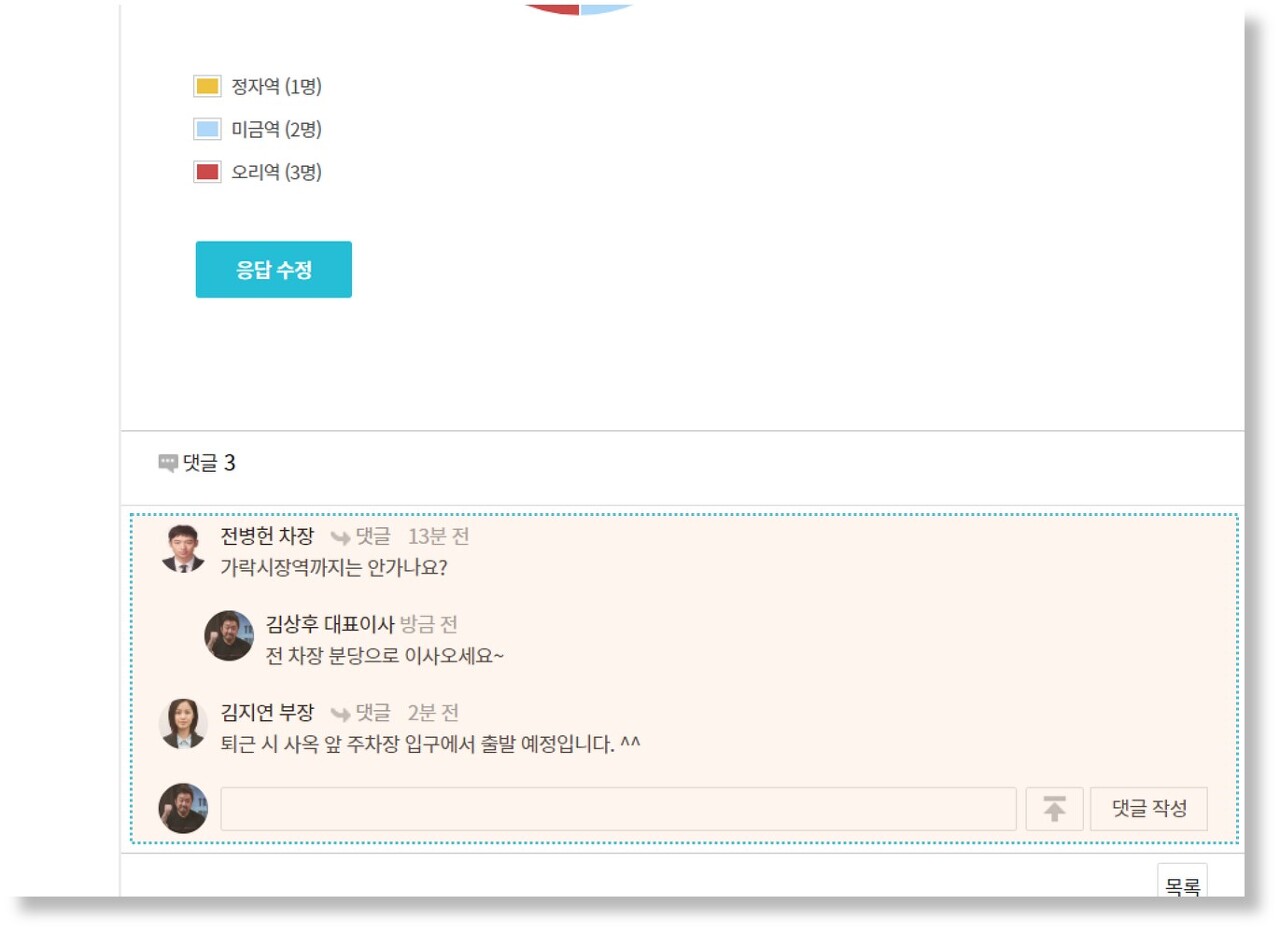 뭐니뭐니해도 설문 역시 직원들의 의견이 가장 중요한 만큼 설문 현황 화면에서 댓글 기능을 통해 실시간 의견을 주고 받을 수 있습니다! 참여자는 댓글 의견을 바탕으로 응답을 수정할 수도 있고, 관리자는 댓글을 반영하여 설문 내용을 변경할 수도 있겠죠?